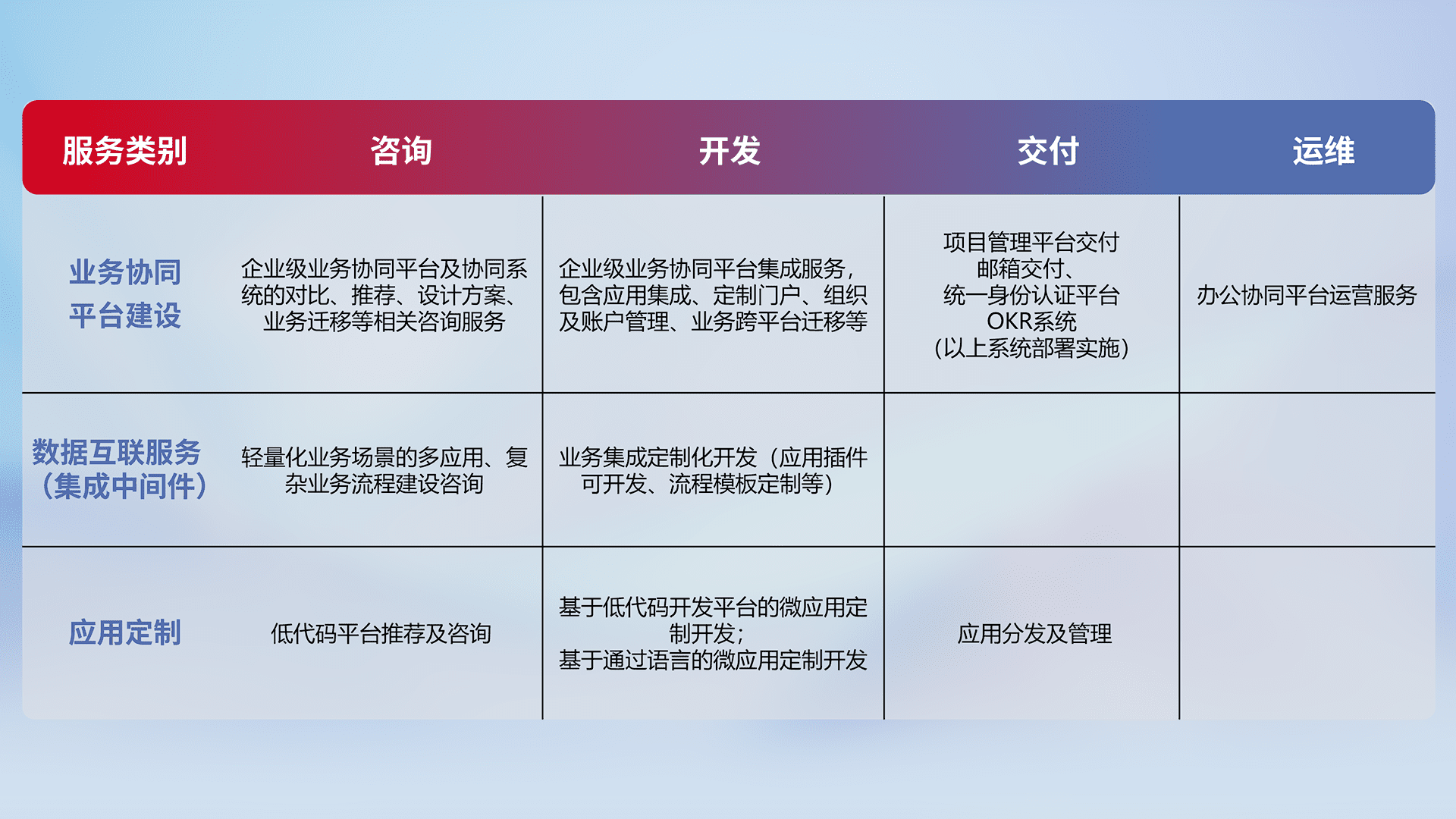 针对钉钉、、企微、、IDaas等平台级产品提供产品的规划、、、方案、、、、交付、、、定制化开发等服务,,实现如统一协同办公、、、、智能客户服务、、、、混合会议管理、、、、智能数据查询、、等业务场景,,,,实现数字化转型。。。